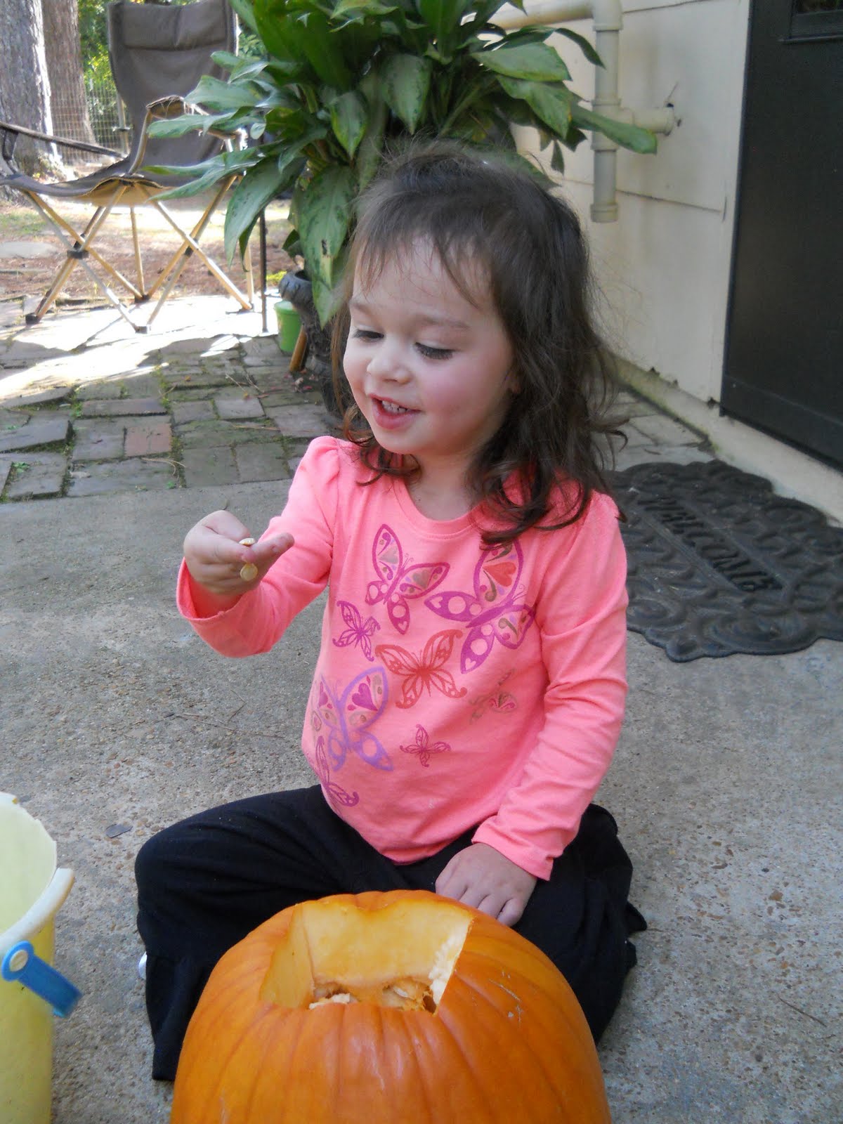 We fully intended on doing this while Jimmy was home. OK, I fully intended on Jimmy doing this while he was home :) ...but we did not get around to it. So Kamryn and I tackled the pumpkin carving yesterday. It wasn't so bad. It may not be the best pumpkin in the world, but it's our little creation and the memories are what it's all about anyway. :)